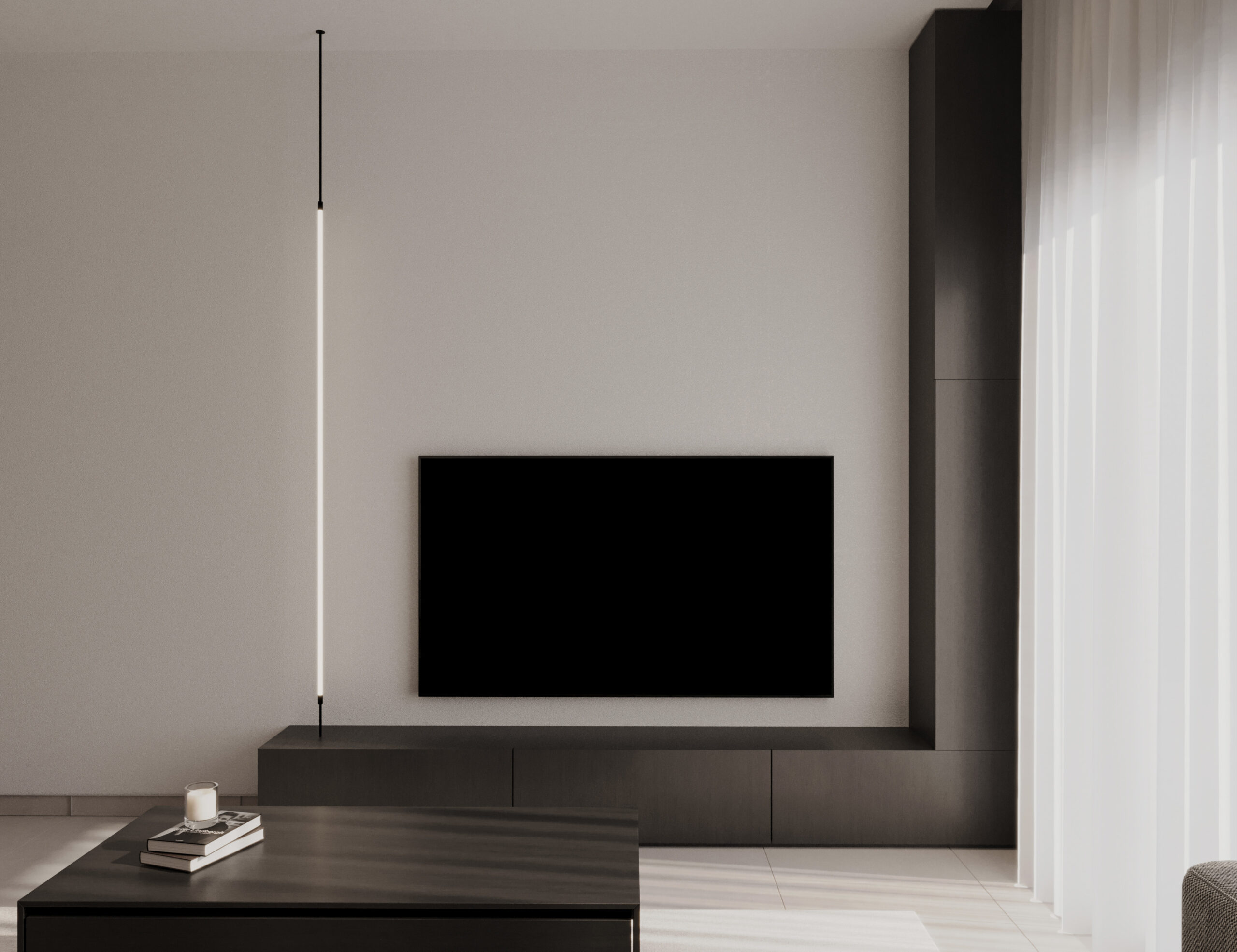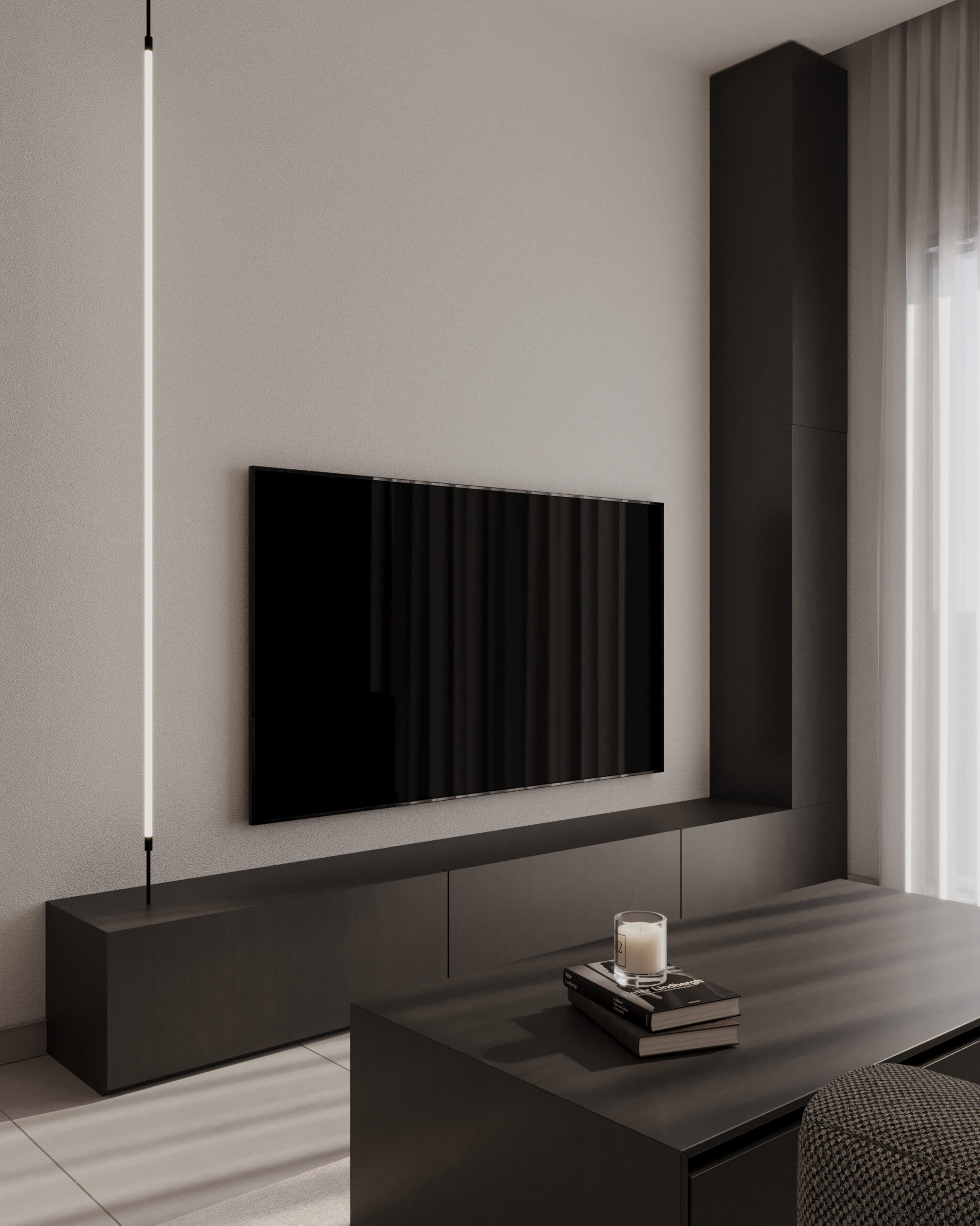 ארון ומזנון טלוויזיה בנגרות אישית מעץ לבוד ציפוי פורניר אלון צבוע שחור מותאם למידות החלל.